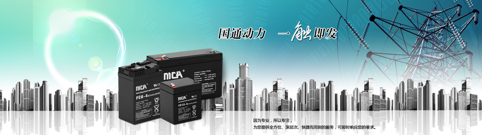 廣東中商國通MCA蓄電池創(chuàng)立于2001年8月,是專注鉛酸蓄電池的研制、開發(fā)、制造和銷售的高新科技企業(yè),MCA蓄電池公司主導(dǎo)產(chǎn)品為通信用電池、動力電池、光伏儲能用電池、高功率電池。 MCA電池產(chǎn)品廣泛應(yīng)用于通信、電力、金融、鐵路等基礎(chǔ)性產(chǎn)業(yè);太陽能、風(fēng)能、智能電網(wǎng)、電動汽車、儲能電站等戰(zhàn)略性新興產(chǎn)業(yè)。MCA蓄電池經(jīng)過十余年的發(fā)展,MCA公司已成為國內(nèi)外知名的電池制造商。